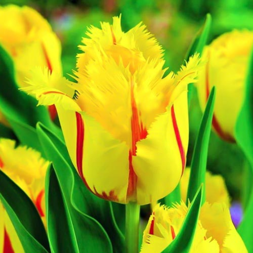 Тюльпан бахромчатый Фламенко – это среднерослый красивоцветущий многолетник из рода луковичных семейства лилейных. Стебель зеленый, сочный, высотой до 40 см, лиственная розетка широкая, листва ланцетная. Расцветает в мае. Цветки бокаловидные, ярко-желтые с алым рантом по центру лепестков. Края чашелистиков окаймлены бахромой.