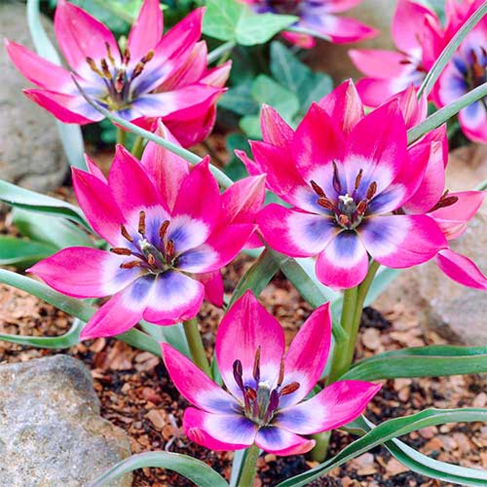 Этот низкорослый сорт (цветонос высотой 10-20 см) полон очарования и изящества. Заостренные лепестки образуют правильную звезду, а в глубине бутона тюльпан имеет синее основание, плавно переходящее в розовый, затем насыщенно малиновый цвет.