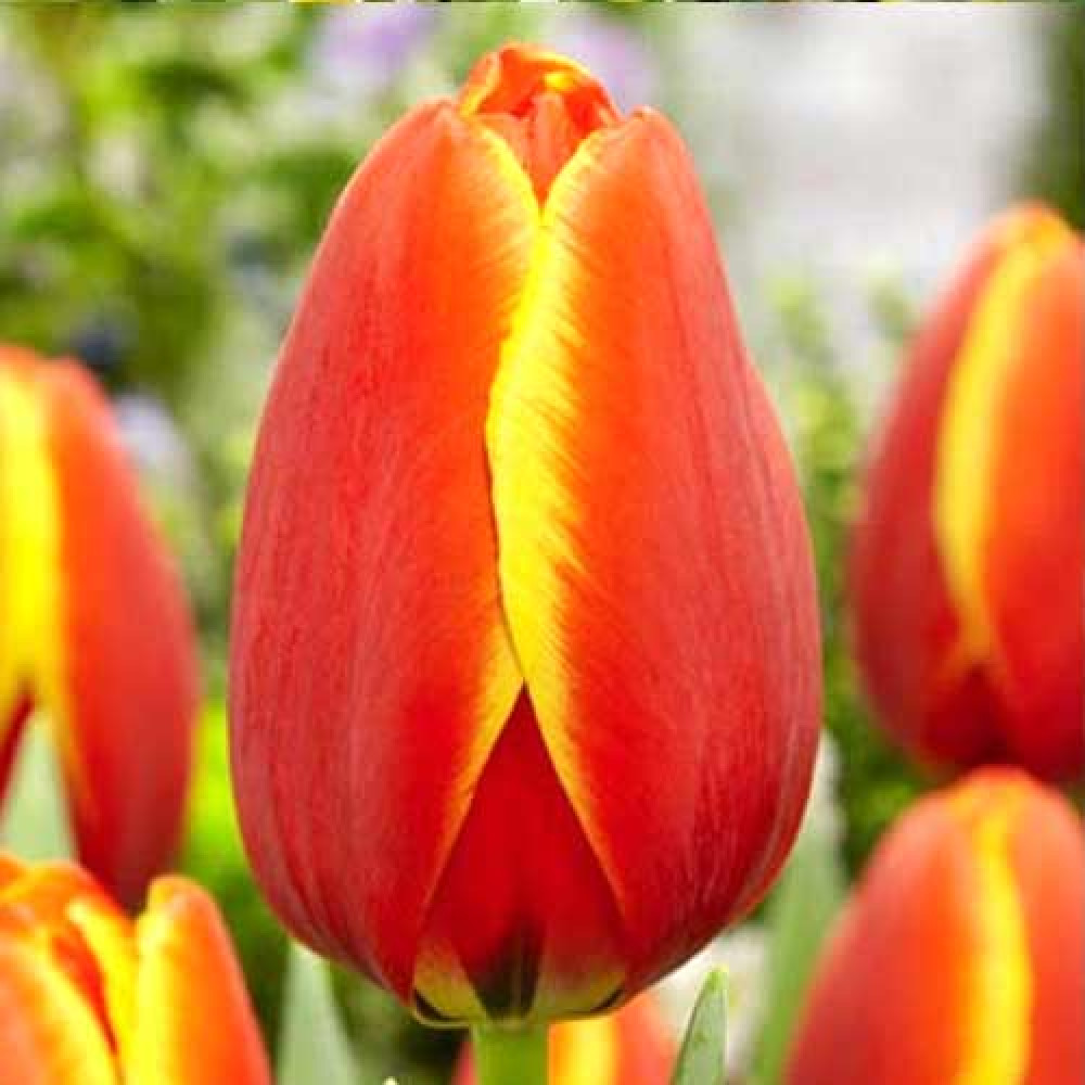Тюльпан Дарвина Ворлдс Фэйворит – изумительный луковичный многолетник высотой от 60 до 80 см с цветами классической формы. Округлый бутон имеет ало-красную окраску, по краям лепестков проходит четкая желтая полоса. Очень ярко и элегантно. Срок цветения – с апреля по май.