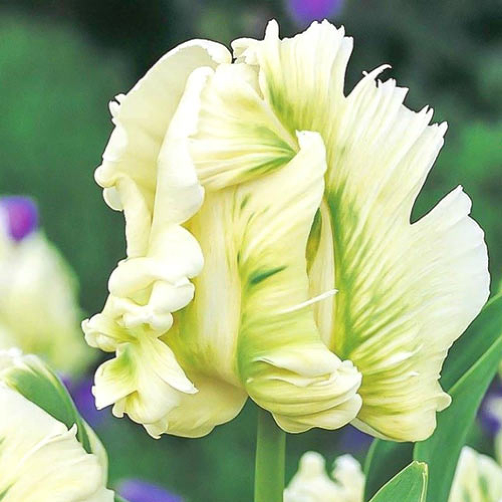 Тюльпан попугайный Супер Пэррот отличается экстра оригинальным цветением. Бледно-желтые лепестки покрыты яркими салатовыми мазками. Форма цветка сильно изрезана и как бы вывернута наизнанку. Прикорневые листья имеют сочно-зеленый окрас. Кажется, что на гибком стебле высотой 50−60 см сидит экзотическая птица с взъерошенными перьями. Растение роскошно смотрится в групповых посадках с ритмом 15−20 см. Цветение продолжается с апреля по май.