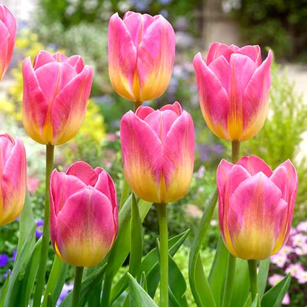 Тюльпан Триумф Том Паус – луковичный многолетник с плотными листьями и очаровательными двухтоновыми цветами ванильно-розовой окраски. Начиная с донца, треть лепестков окрашена в мягкий кремовый цвет, затем оттенок переходит к теплому розовому, а заканчивается бокал по краю темно-розовой каймой. Оригинальный сорт, высота 35 см.