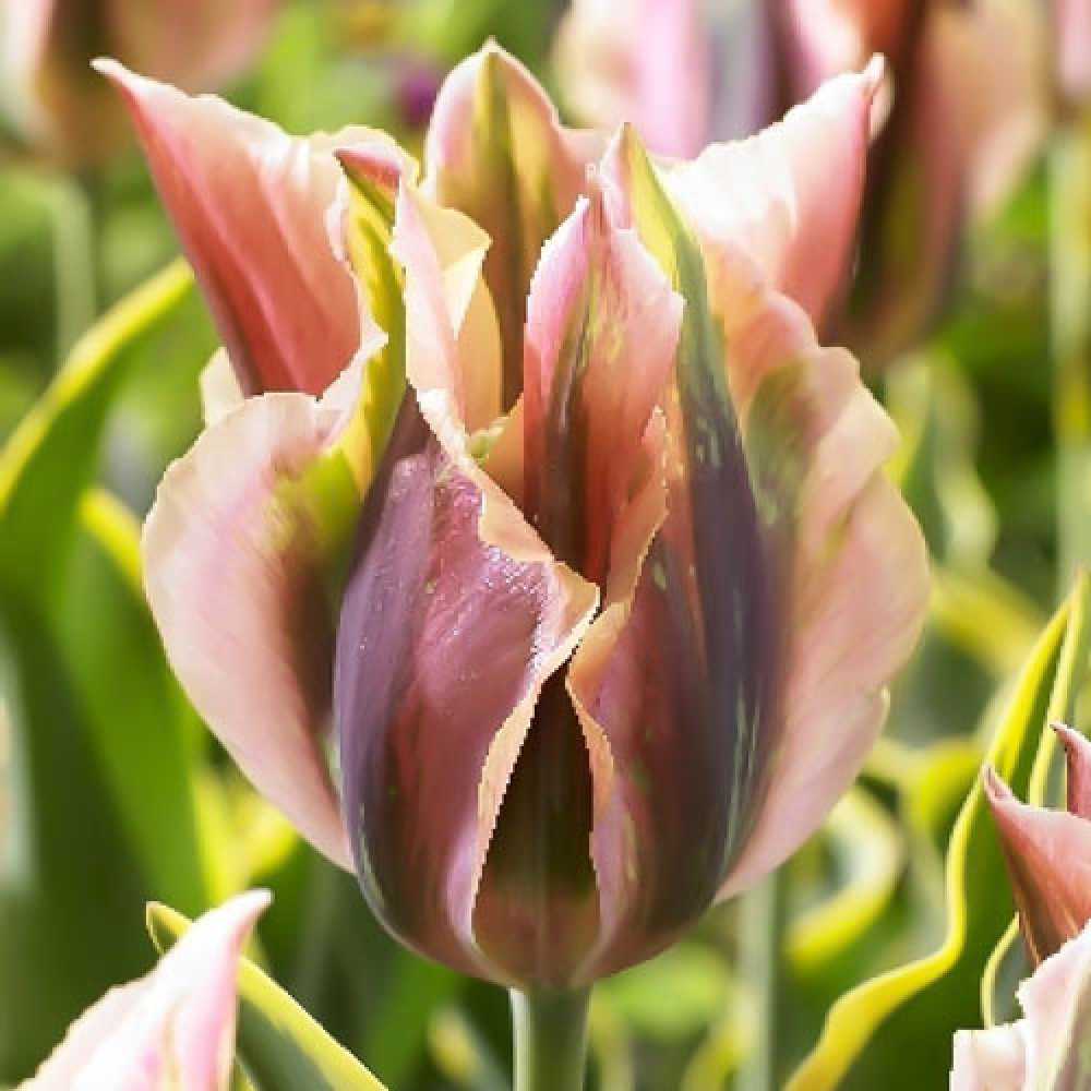 Тюльпан зеленоцветный Грин Ривер – это позднецветущий луковичный многолетник сем. лилейных. Один из редких видов, принадлежащих к классу зеленоцветных тюльпанов. Стебель высотой 45 см, почти без листьев, с оригинальными околоцветниками: рубиновые лепестки украшении снаружи темно-зеленой полосой, края цветолистиков утонченные, волнистые, с желтой каемкой. В целом цветок отличается изящными формами и стойкостью.